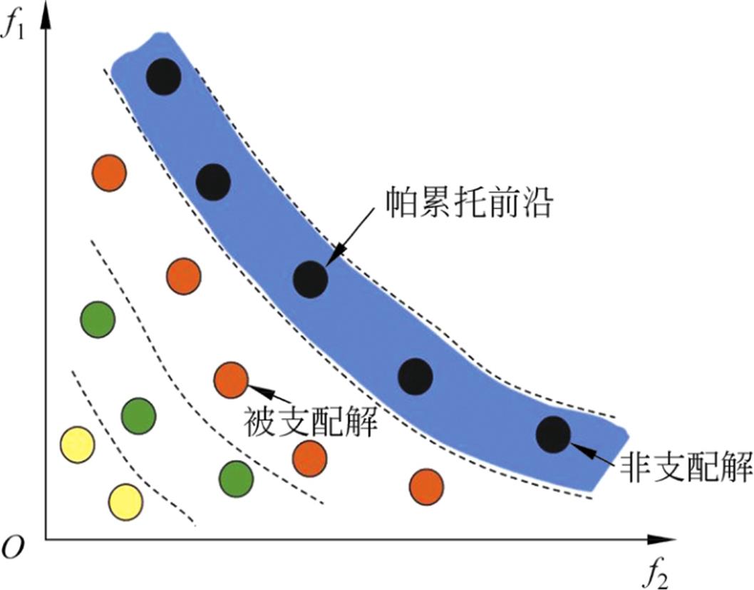 图1.3 多目标优化问题中的非支配解、被支配解和帕累托前沿示意图