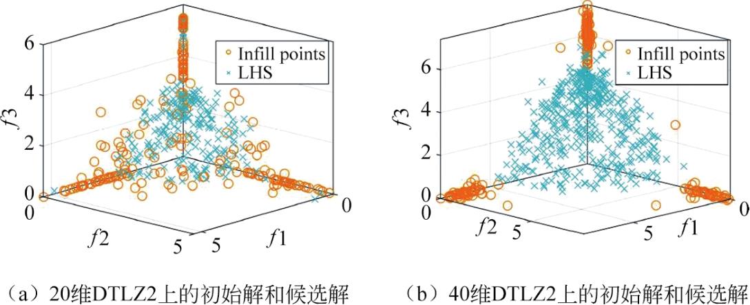 图5.7 基于增广切比雪夫函数的获取函数和 ∈ -贪心获取函数在DTLZ5-7上获得的200个最终候选解