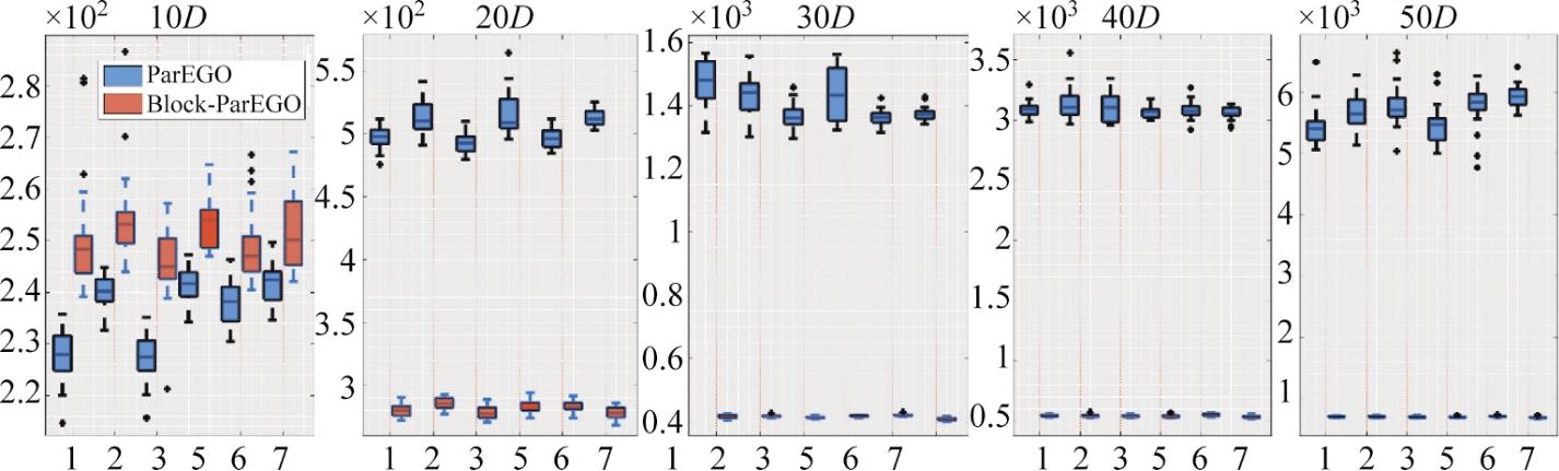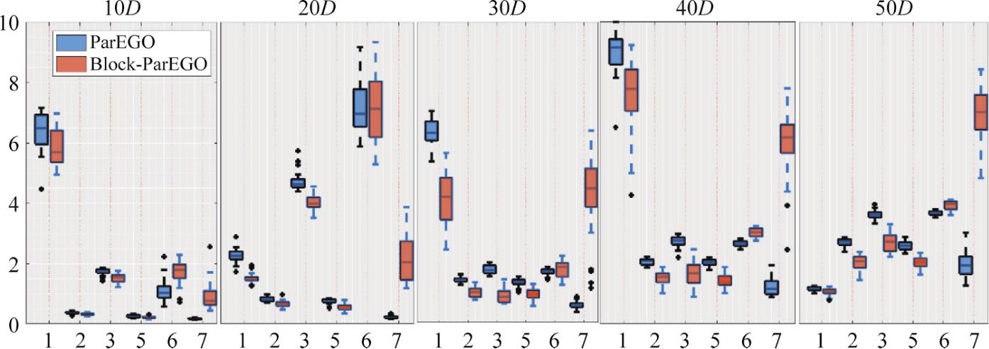 图5.4 ParEGO和Block-ParEGO在DTLZ问题上运行30次的IGD均值