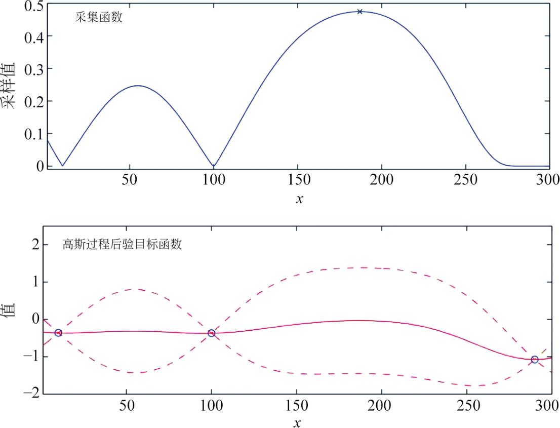 图2.1 贝叶斯优化示意图:最大化具有一维连续输入的目标函数 f