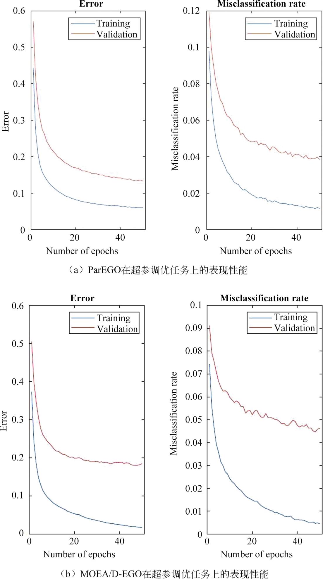 图4.6 ParEGO和MOEA/D-EGO在超参调优任务上的表现性能