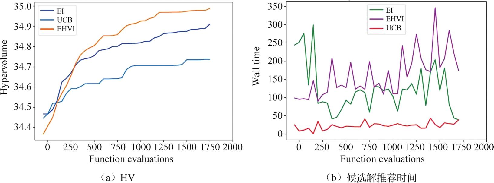 图7.2 EI、UCB和EHVI在DTLZ2上HV值和候选解推荐时间(秒)随函数评估次数的变化趋势图