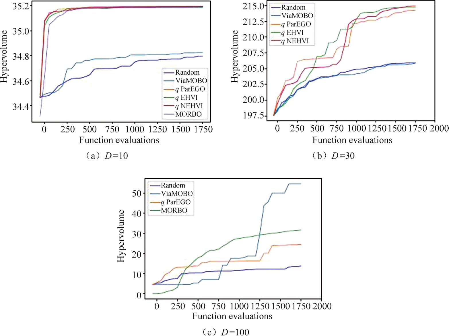 图7.1 相关基线方法在 D ={10,30,100}维DTLZ2问题上的HV值随函数评估次数的变化趋势图
