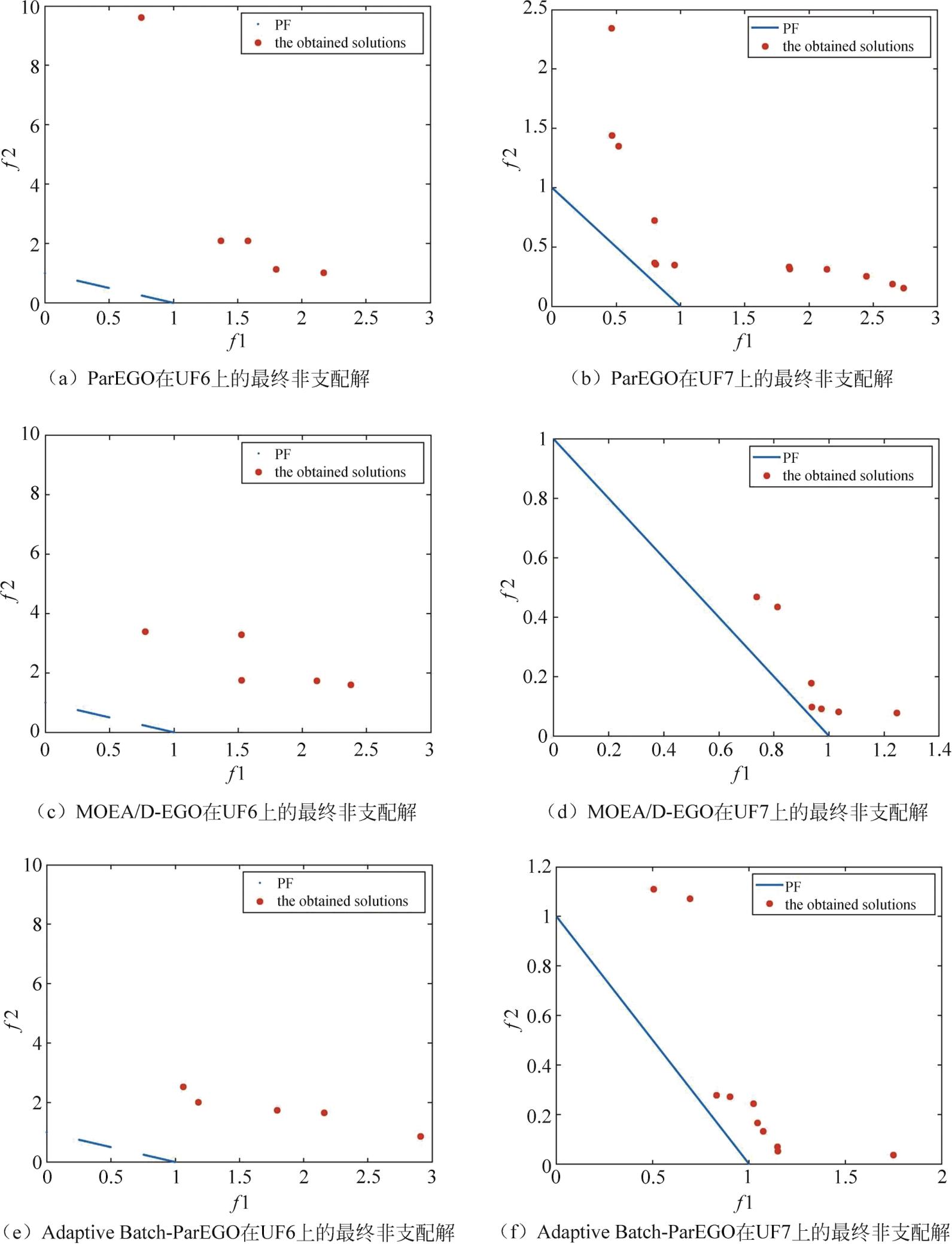 图4.5 ParEGO、MOEA/D-EGO和Adaptive Batch-ParEGO在UF6和UF7上得到的最终非支配解