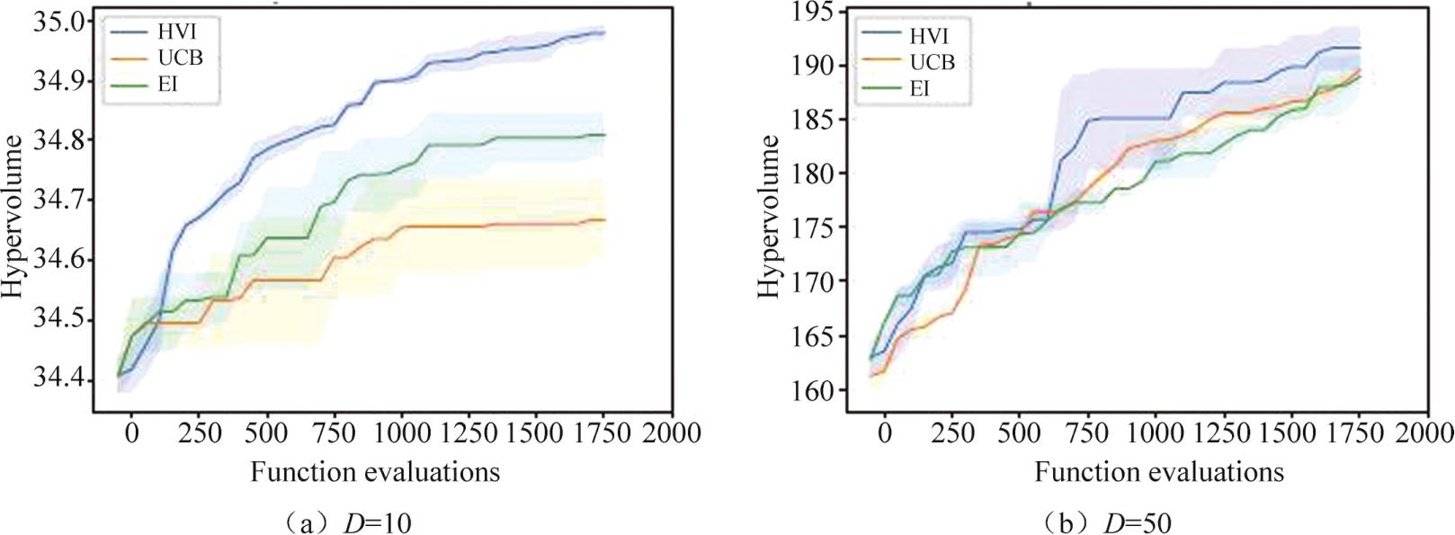 图7.3 EI、UCB和HVI在 D ={10,50}维DTLZ2上HV值随函数评估次数的变化趋势图