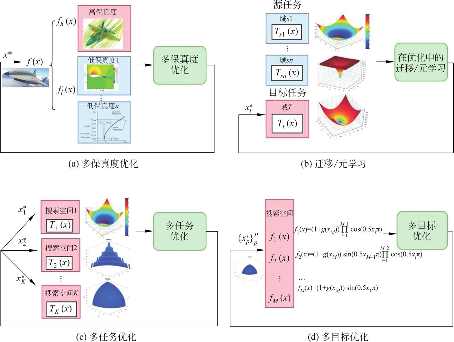 图3.2 多保真度优化、迁移/元学习、多任务优化和多目标优化之间的相似性和差异