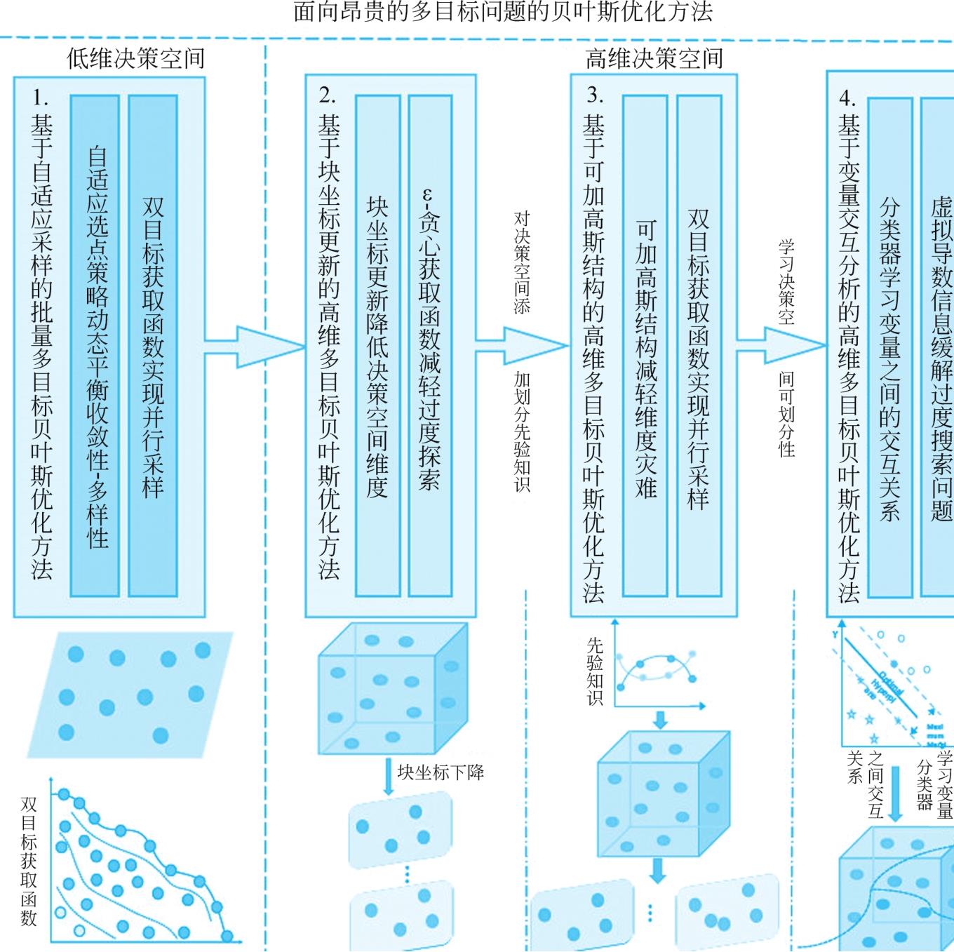 本书研究总体框架如图1.4所示,围绕低维决策空间和高维决策空间中的串行函数评估、获取函数优化效率低、维度灾难和边界问题等关键问题,针对求解昂贵的多目标优化问题的贝叶斯优化方法展开了四方面的研究。本书的具体研究内容如下。