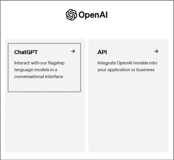步骤04 开始登录。打开OpenAI官方网站,单击右上角的Log in按钮,在跳转之后的页面中选择ChatGPT选项,如图1.6所示。