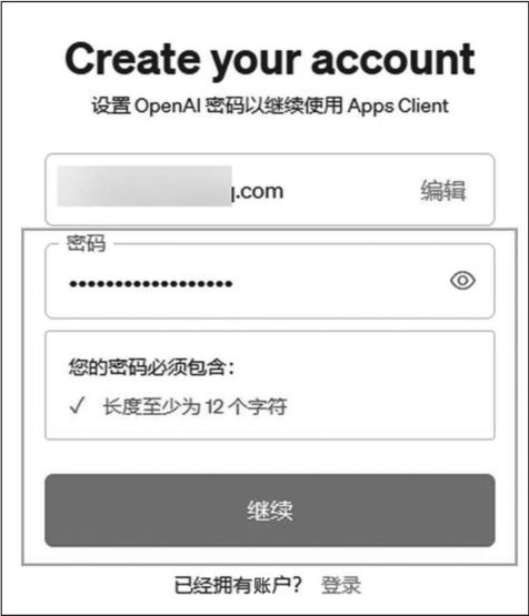 在“密码”文本框中输入注册时设置的密码,然后单击“继续”按钮,即可进入ChatGPT首页,如图1.9所示。