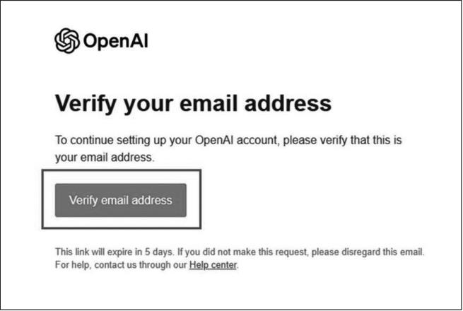步骤03 进行邮箱验证。此时OpenAI会向之前输入的电子邮箱发送一封验证邮件,在邮箱内查收该邮件,单击邮件内的Verify email address按钮进行验证,如图1.5所示。