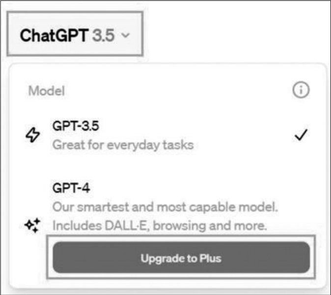 在首页左上角的ChatGPT 3.5处单击,在弹出的下拉列表中单击Upgrade to Plus按钮,如图1.10所示。