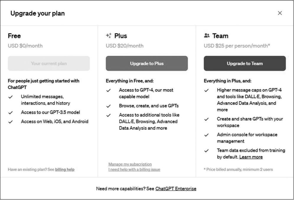 步骤05 升级版本。ChatGPT自推出以来,OpenAI已经发布了多个版本,每个版本都在性能、功能和可用性等方面有所改进。2023年,OpenAI推出了ChatGPT的最新版本ChatGPT 4.0,它是一个跨模态模型,不仅能处理文本,还能理解和生成图像。读者可根据自己的需求来决定是否要对ChatGPT的版本进行升级。如果想要升级版本,可以按以下步骤进行操作。