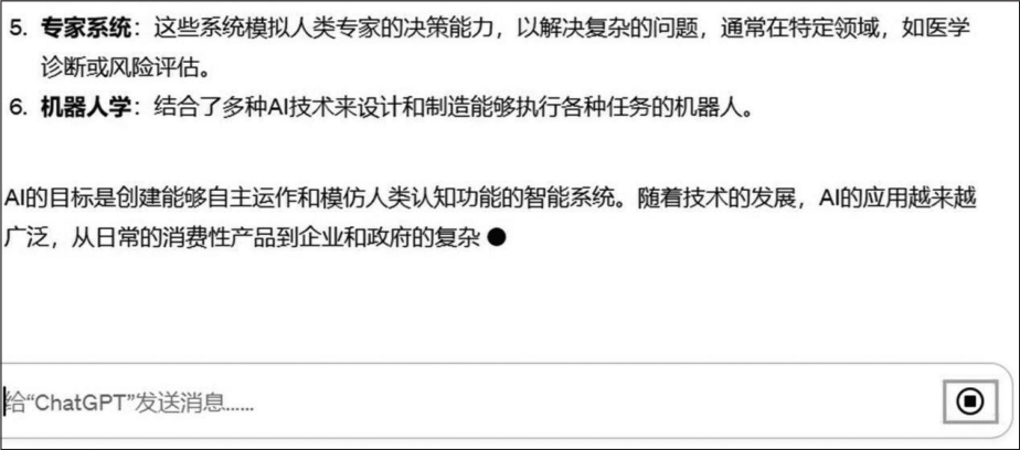 步骤04 暂停生成回答。在等待ChatGPT生成回答的过程中,如果想要暂停生成回答,单击对话框右侧出现的“暂停”按钮即可,如图1.15所示。