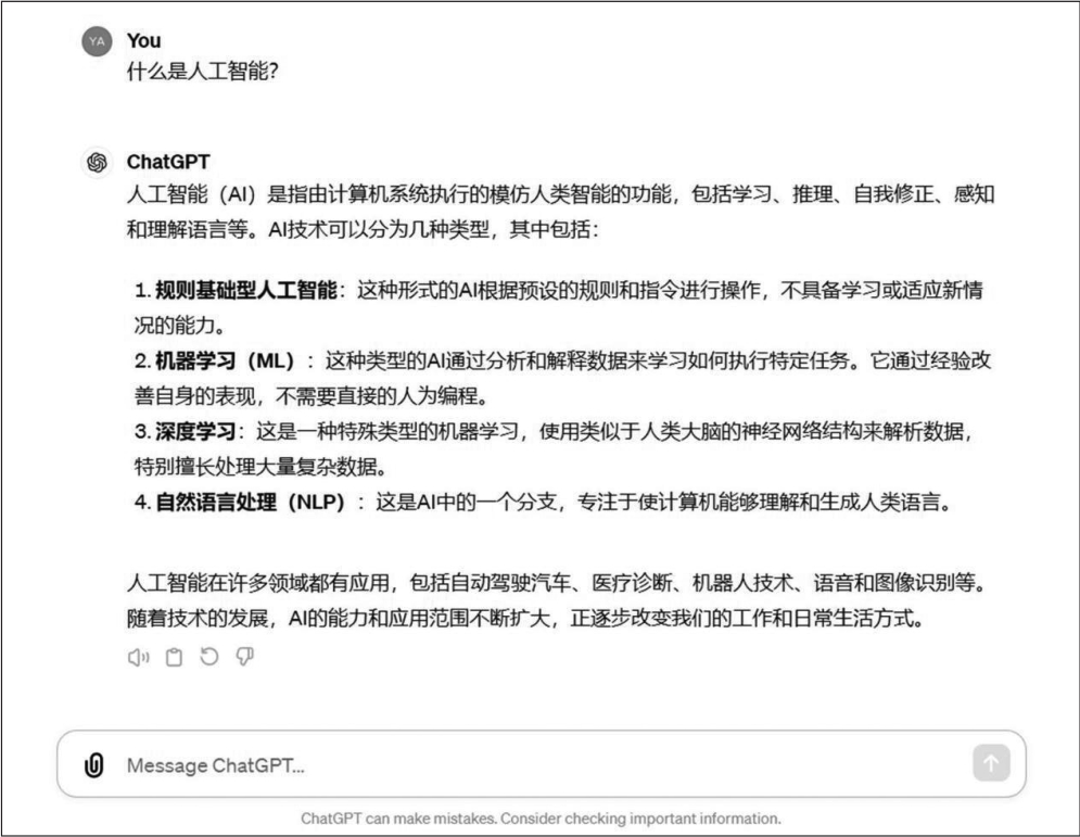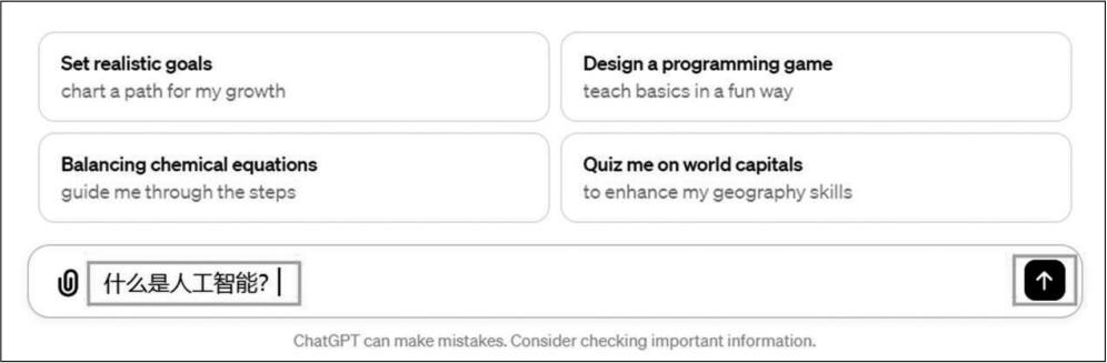步骤01 输入问题或关键词。在ChatGPT首页界面底部的对话框中输入:什么是人工智能?然后单击右侧的箭头按钮或者按Enter键进行提交,如图1.12所示。