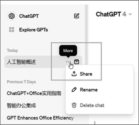 步骤06 管理对话记录。ChatGPT首页左侧边栏里会出现生成过的对话记录,用户可以对这些记录进行管理。选择某一条对话记录,单击其右侧的More按钮,在下拉列表中单击Share按钮,即可分享对话记录;单击Rename按钮,即可更换对话记录的名字;单击Delete chat按钮,即可删除该对话记录。如图1.17所示。