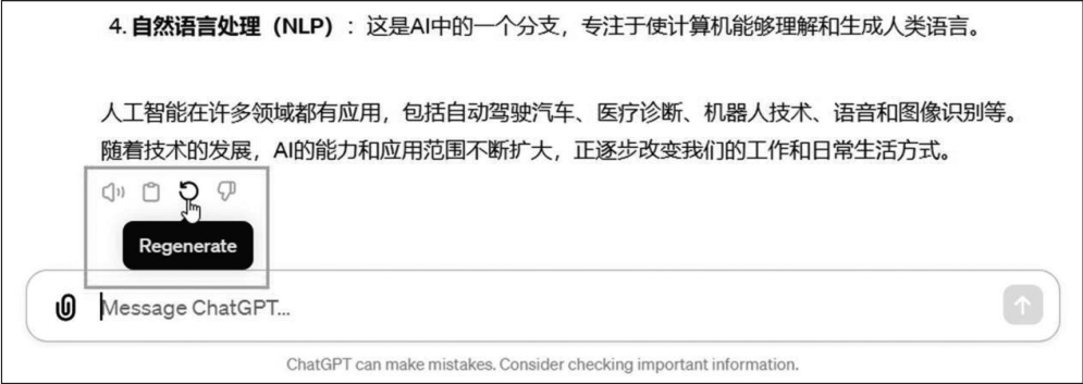 步骤03 管理回答。将鼠标指针移至答案界面附近,会在答案下方出现4个操作按钮,依次是Read Aloud(朗读)、Copy(复制)、Regenerate(重新生成)、Bad Response(错误回复),单击相对应的按钮,便会立刻执行这些操作,如图1.14所示。