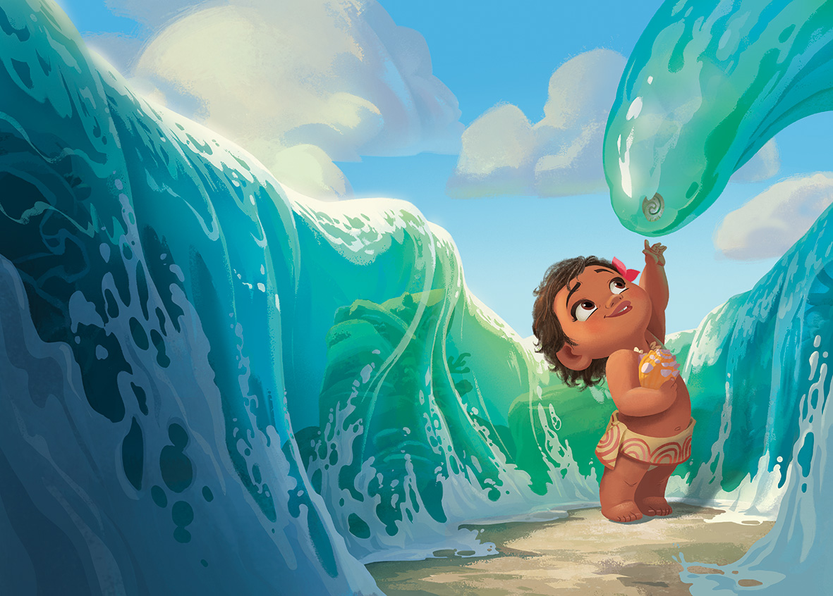 这时,海面隆起,释放出一小股海浪,它旋转着绕过莫阿娜,恰好悬浮在她头顶上方。它神奇地立在那儿,似乎在向她问好。莫阿娜也咧嘴对它一笑,还伸出手指戳了戳它,像戳泡泡一样。一小股海水滴落到莫阿娜身上,让她开心得咯咯直笑。