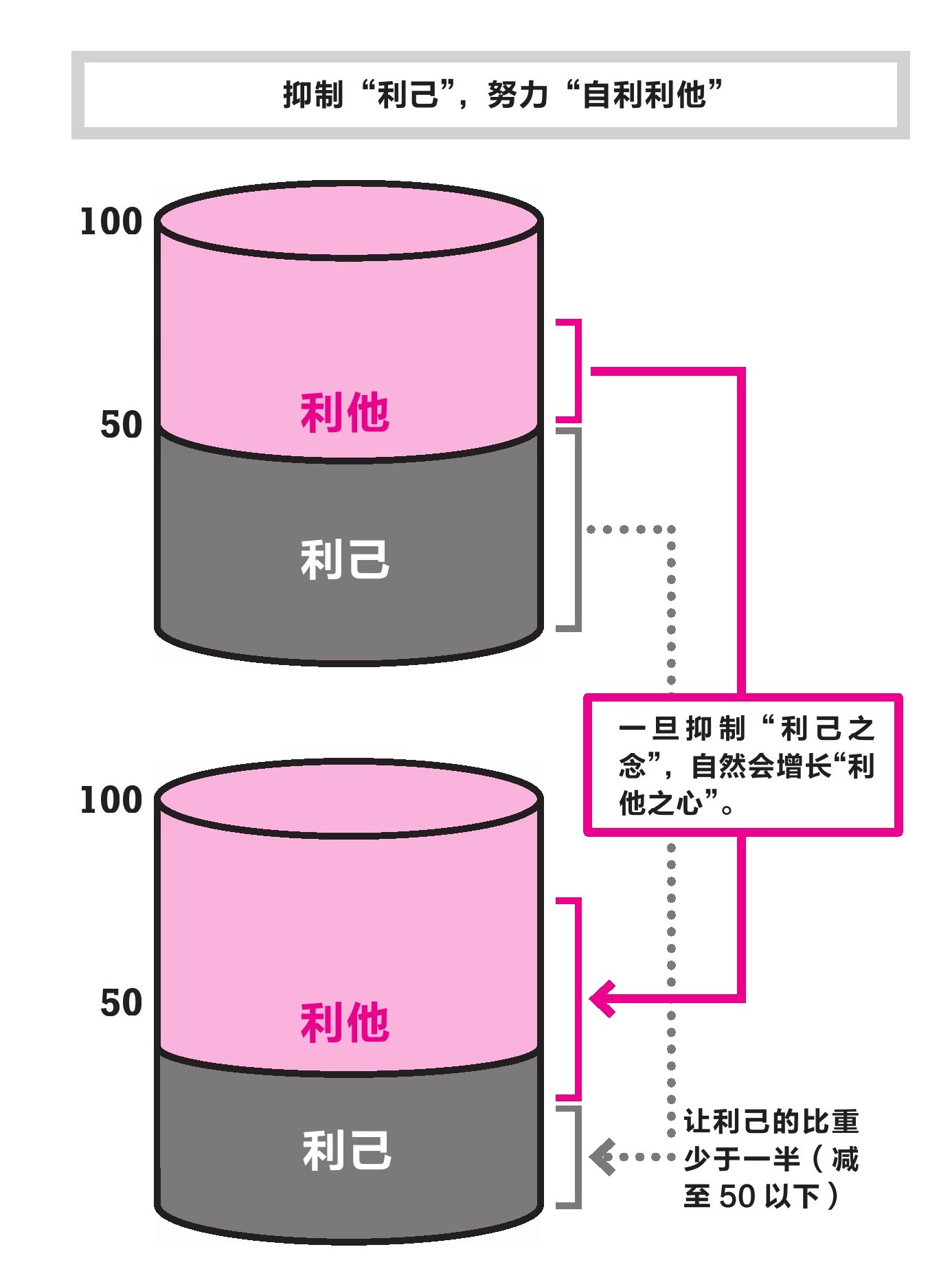 话虽如此,人天生具有不少本能欲求,要完全清零本能着实困难。鉴于此,作为起步和入门,我们应逐渐减少利己在心中所占的比重,假设利己和利他在心中的量合计为100,则我们要先至少努力自律,让利己的比重少于一半 (减至50以下) 。