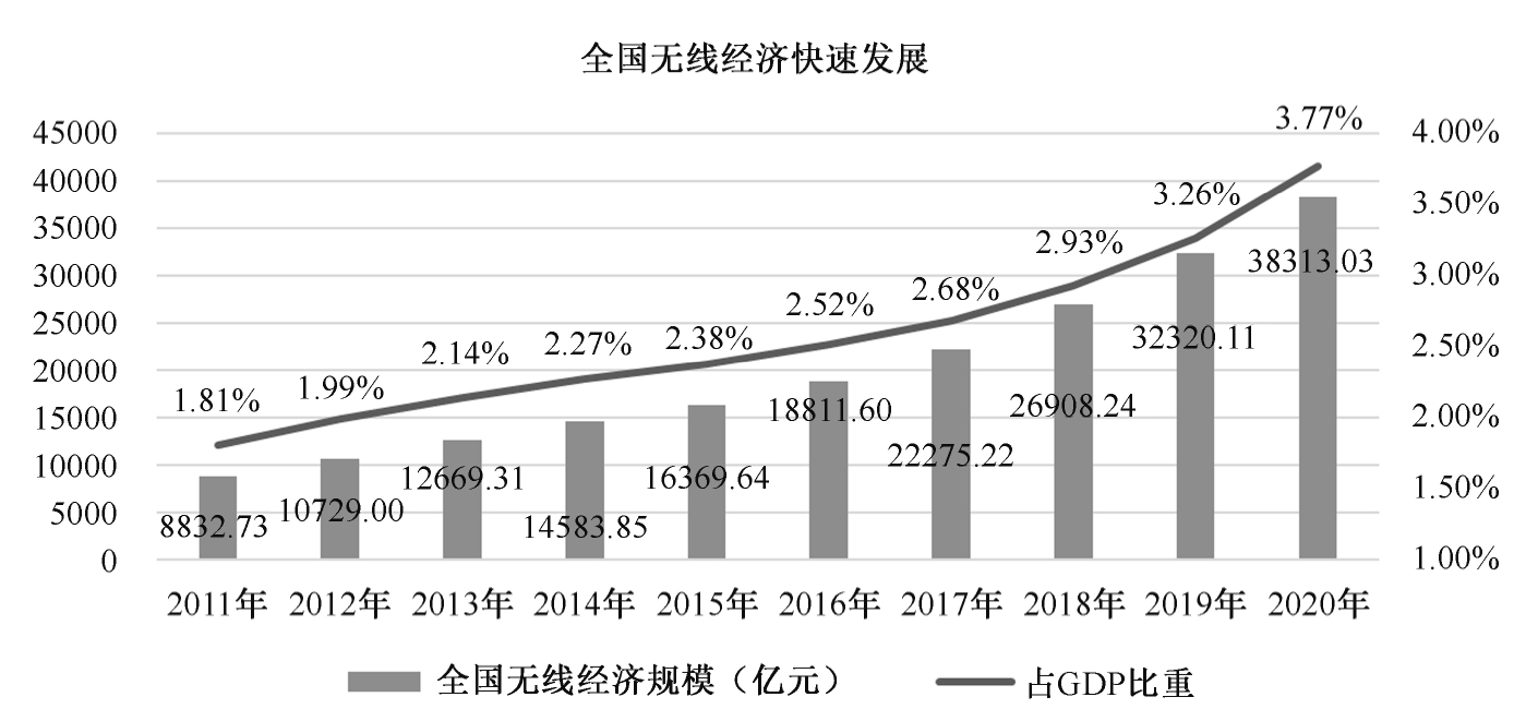(1)无线经济已成为我国国民经济的重要组成部分,2020年规模已超3.8万亿元,占我国GDP比重约为3.8%;