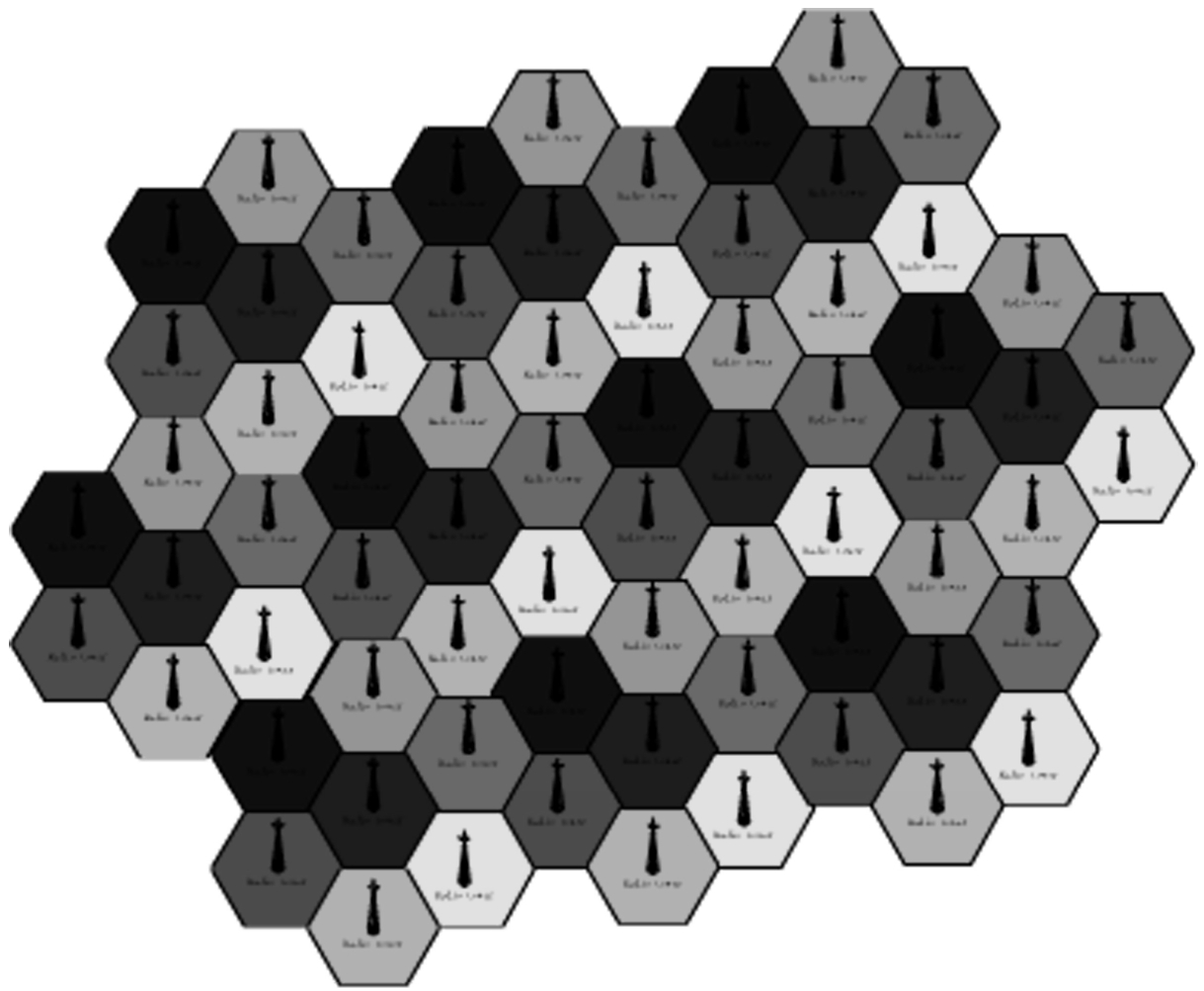 在公众移动通信系统中,最著名是基于物理空间频谱复用的蜂窝通信,图3.3为蜂窝通信原理示意。1978年,贝尔实验室成功测试了世界上第一个蜂窝移动通信系统AMPS(Advanced Mobile Phone System),并于1983年正式投入商用,开启了蜂窝移动通信时代。然而这种1G系统在技术上存在诸多局限性,如无统一标准、业务量小、质量差(采用模拟调制技术)、无加密和传输速率低等。