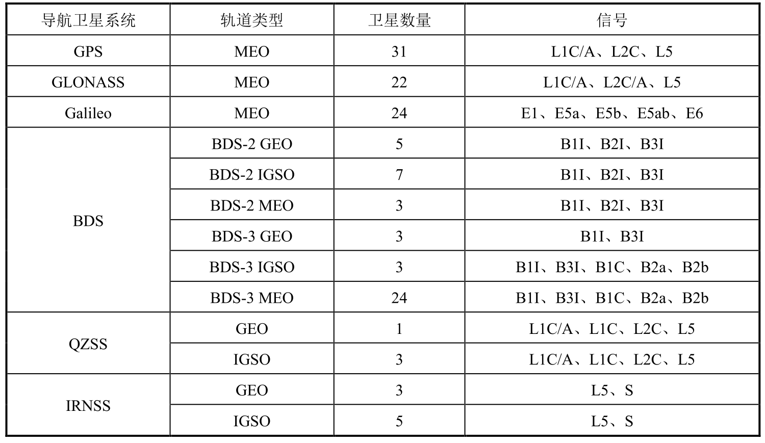 目前,全球的导航定位系统已呈现百花齐放的局面。截至2022年1月,在轨运行的导航卫星数量已达134颗,并且拥有丰富的信号频谱资源,导航卫星运行情况如表3.7所示 [16] 。从表中可见,GPS、GLONASS和Galileo的星座均由中轨道卫星(MEO)组成,而BDS创新性地使用了包含GEO卫星、倾斜地球同步轨道(Inclined Geo Synchronous Orbit,IGSO)卫星和(Medium Earth Orbit,MEO)卫星的混合异构星座。当前,北斗系统(包括BDS-2和BDS-3)共有45颗在轨卫星,可为全球用户提供PNT服务。