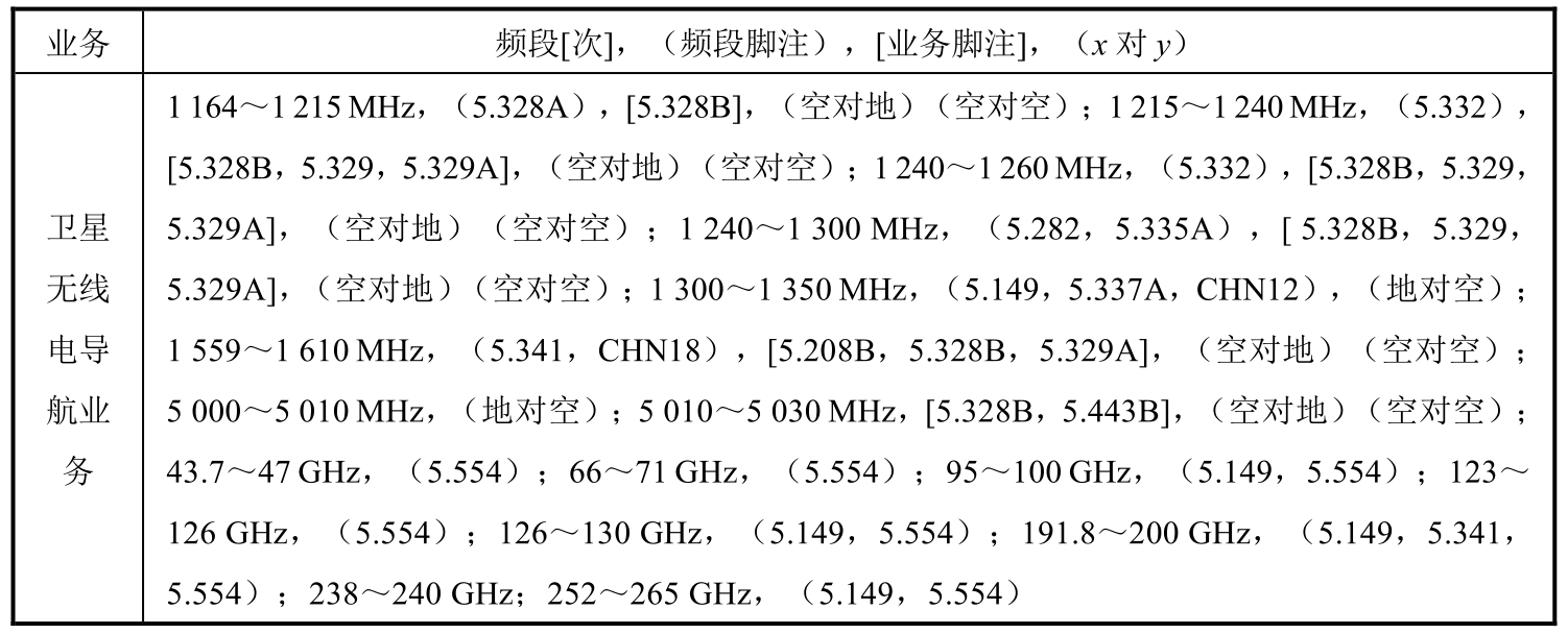 卫星无线电导航业务(Radio-navigation-Satellite Service)是用于无线电导航的卫星无线电测定业务(Radio-determination-Satellite Service)。《中华人民共和国无线电频率划分规定》(2023年)为卫星无线电导航业务划分了15个频段,全部为主要业务频段,见表3.6所示。表中,每个频段采用“频段[次]”“(频段脚注)”“[业务脚注]”和“( x y )”编码,表中没有“频段[次]”字段表明全部为主要业务;“(频段脚注)”“[业务脚注]”字段部分有脚注标记写在括号内,无脚注标记则缺省,“( x y )”字段表示(空对地)(空对空)或(地对空),脚注解释请查阅《中华人民共和国无线电频率划分规定》。例如,表3.3中1164~1215MHz、(5.328A)、[5.328B]和(空对地)(空对空)各字段的意义分别是:1164~1215MHz频段为主要业务;“5.328A”表示在1164~1215MHz频段内卫星无线电导航业务的电台应按照第609号决议(WRC-07,修订版)的规定运行;“5.328B”表示无线通信局于2005年1月1日以后收到完整的协调或通知资料的卫星无线电导航业务的系统和网络,在使用1164~1300MHz、1559~1610MHz和5010~5030MHz频段时,应采用《无线电规则》第9.12款、第9.12A款和第9.13款的规定;该频段服务为(空对地)(空对空)。