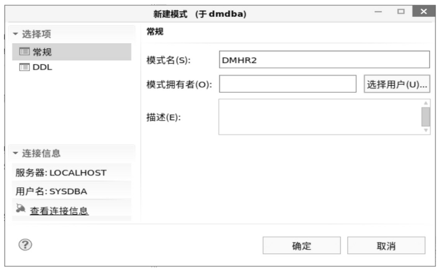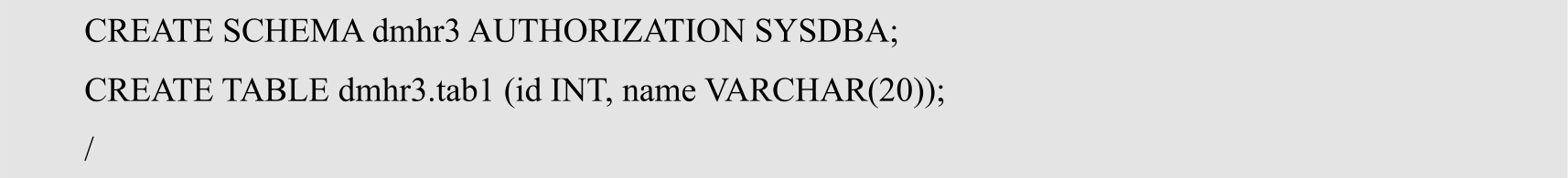【 例2-8 】以用户SYSDBA登录数据库,为SYSDBA用户增加一个模式,模式名为DMHR3,并在DMHR3模式中定义一张表TAB1。SQL命令如下: