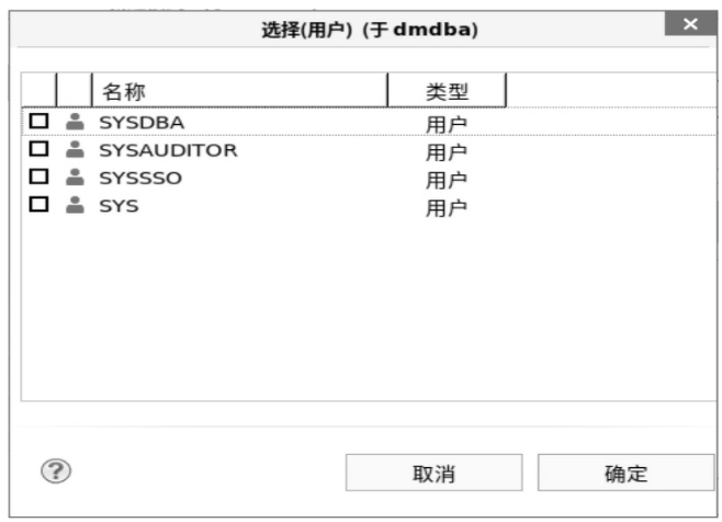 步骤3:进入如图2-12所示的常规参数页面,设置模式名为“DMHR2”。单击“选择用户”按钮,弹出“选择(用户)”对话框,如图2-13所示,选中SYSDBA用户并单击“确定”按钮返回。