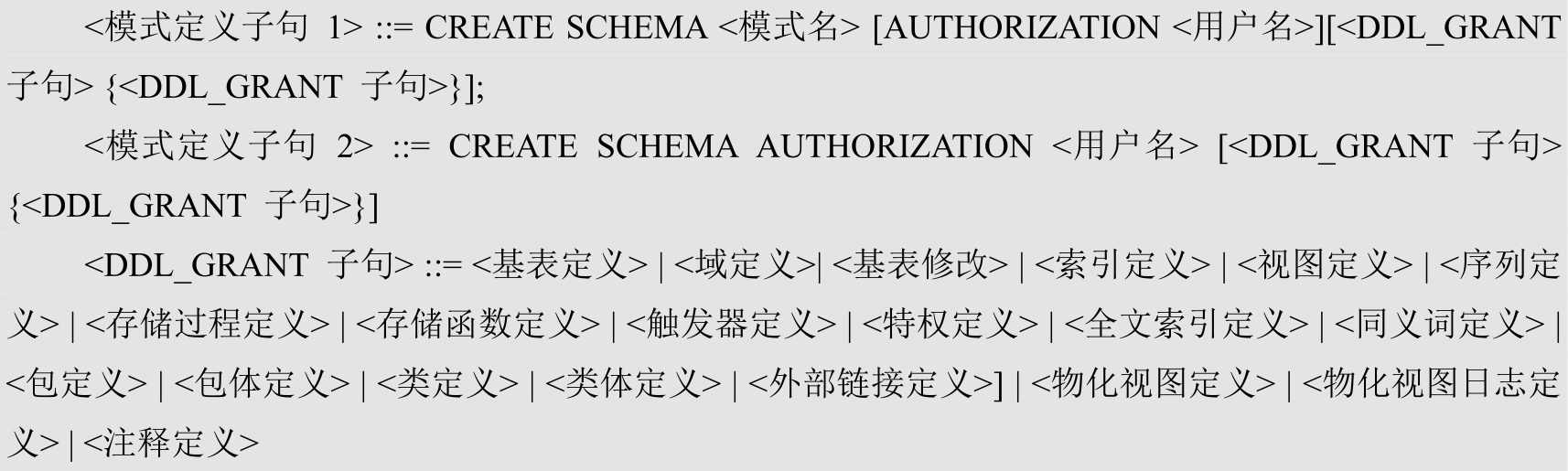 <用户名>指明给哪个用户创建模式,如果默认用户名,则默认给当前用户创建模式。语法格式中其他部分都是可选项,如<基表定义>、<基表修改>、<视图定义>等子句,后面章节将详细介绍。