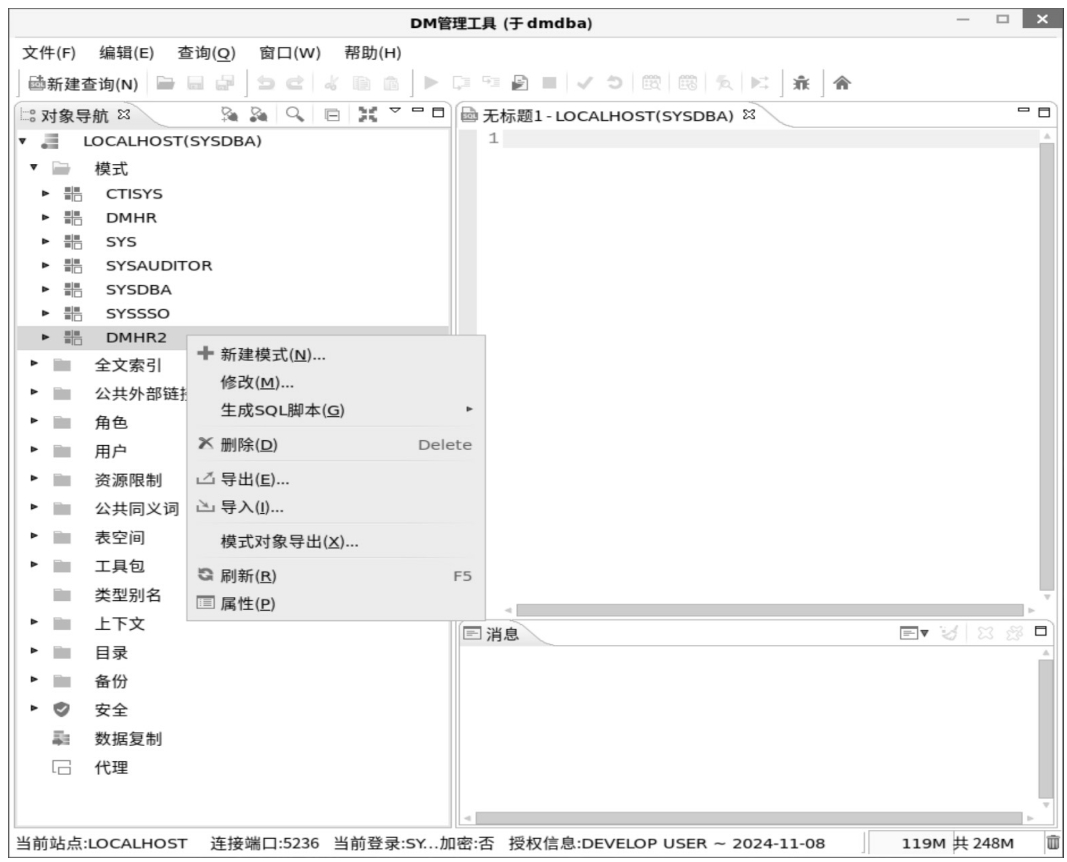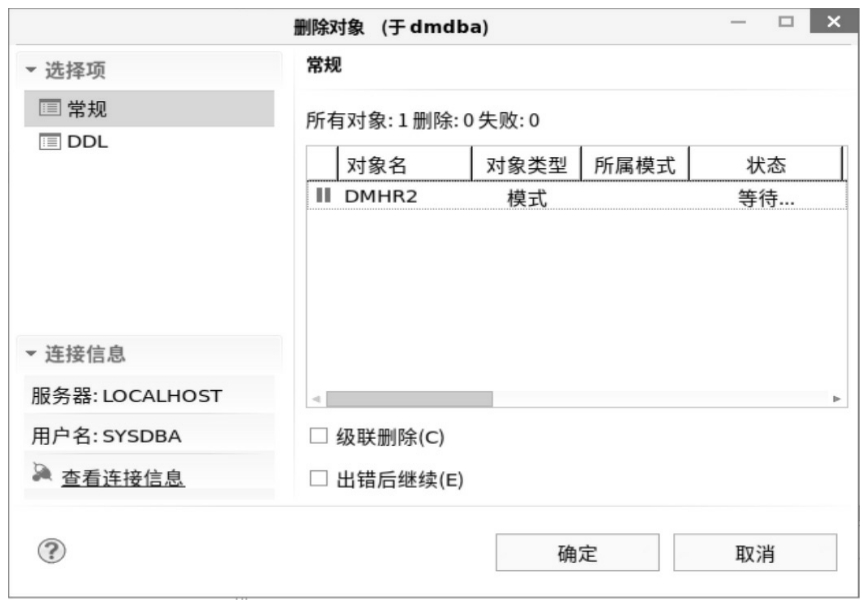 【 例2-10 】以用户SYSDBA登录DM管理工具,删除DMHR2模式。