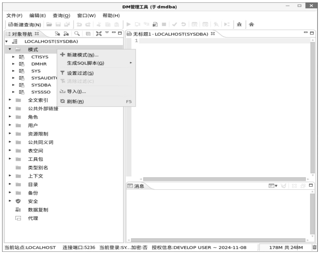 步骤1:启动DM管理工具,以用户SYSDBA登录数据库,右键单击对象导航窗体中的“模式”节点,弹出如图2-11所示的操作界面。