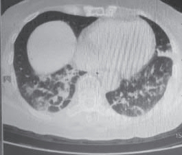 辅助检查:入院后复查动脉血气分析(吸氧 3 L):pH 7.52,PCO 2 33 mmHg,PO2 144 mmnHg,D-二聚体 1.11 mg/L,铁蛋白635 ng/mL,降钙素原1.5 ng/mL,ESR 53 mm/h。肝功能、肾功能、心肌标志物、术前检查全套 10 项、抗酸染色(结核杆菌)、真菌涂片、尿液分析、粪便常规、大便隐血、心电图未见明显异常。