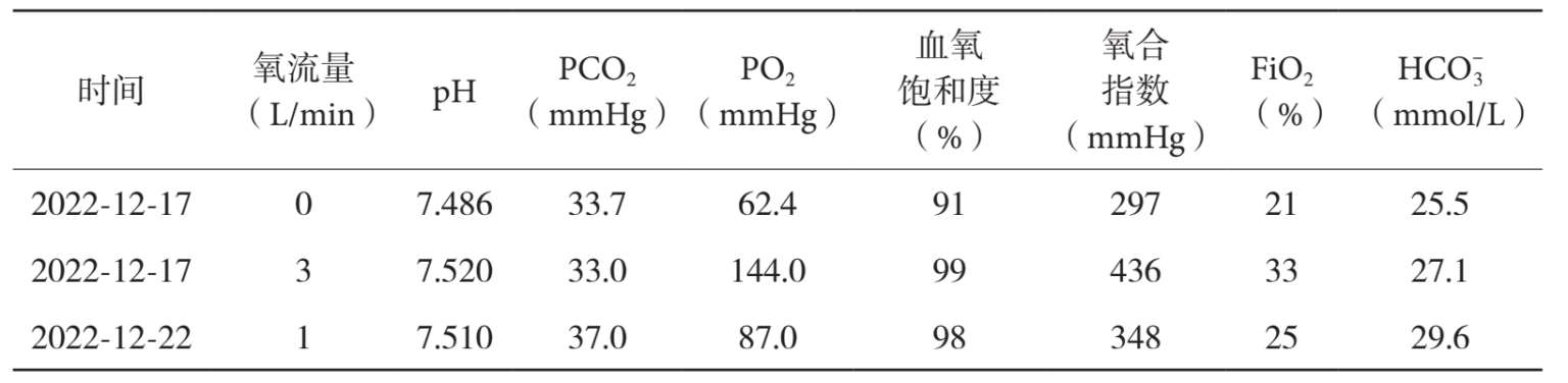 (1)一般治疗:入院后予以心电监护,监测血氧饱和度,清醒俯卧位通气,鼻导管给氧 1~3 L/min,根据动脉血气分析结果调整吸氧浓度。