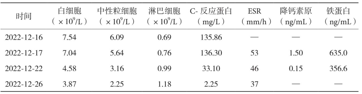 (2)抗菌治疗:入院后查铁蛋白 635 ng/mL,降钙素原 1.5 ng/mL,提示合并细菌感染可能,故 2022 年 12 月 17 日予以盐酸莫西沙星氯化钠注射液(0.4g,静脉滴注,qd),在症状好转的情况下连用抗生素 3 天后复查血常规,连用 5 天后复查铁蛋白、降钙素原。体温恢复正常、检查指标好转后停药。