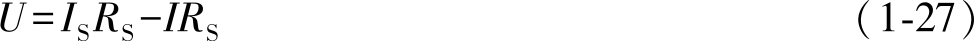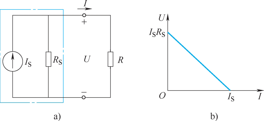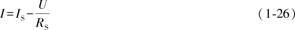 由式(1-27)得到实际电流源模型的伏安特性曲线如图1-53b所示。当负载端开路时,电流 I =0,此时电流源模型的端电压( U = I S R S )最高。随着输出电流 I 的增加,电压 U 降低,表明这个电路模型能够表示实际电流源的伏安关系。