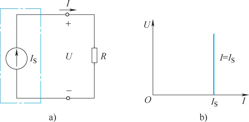 理想电流源的外特性如图1-52b所示。这是一条平行于纵轴( U 轴)的直线,表明它输出的电流 I 始终等于 I S ,保持恒定,所以理想电流源又称 恒流源 。