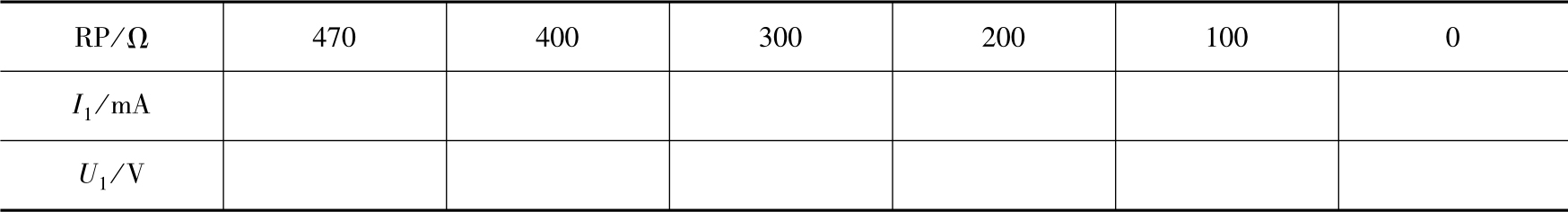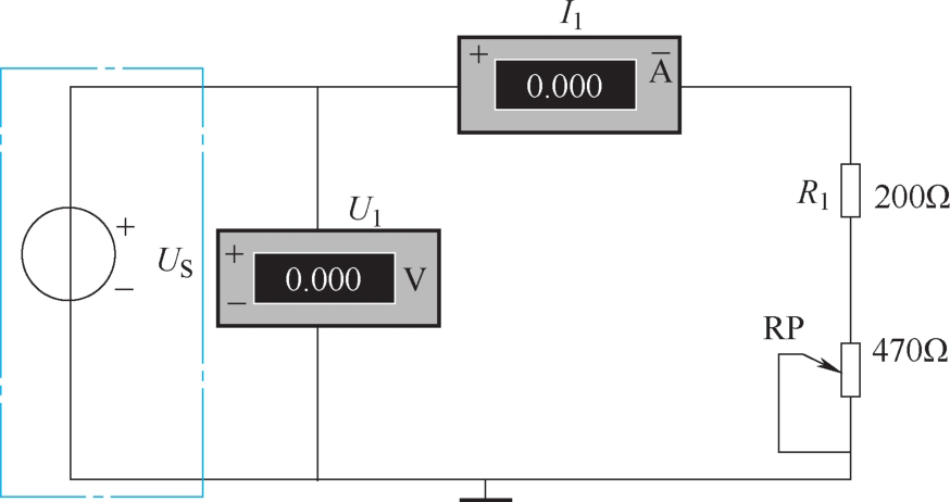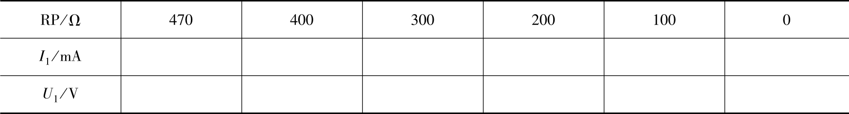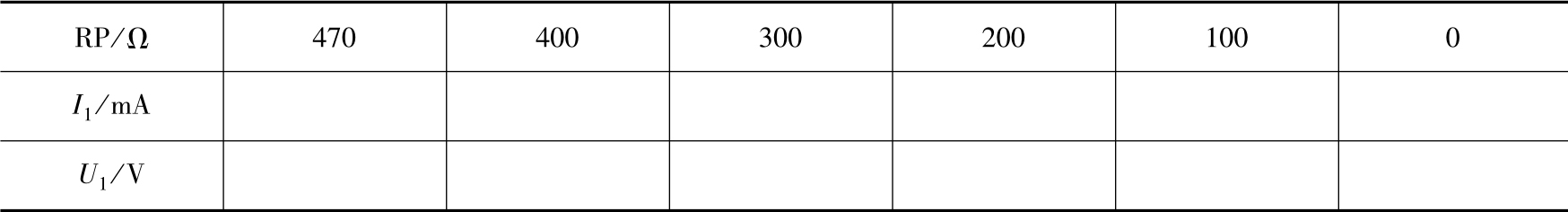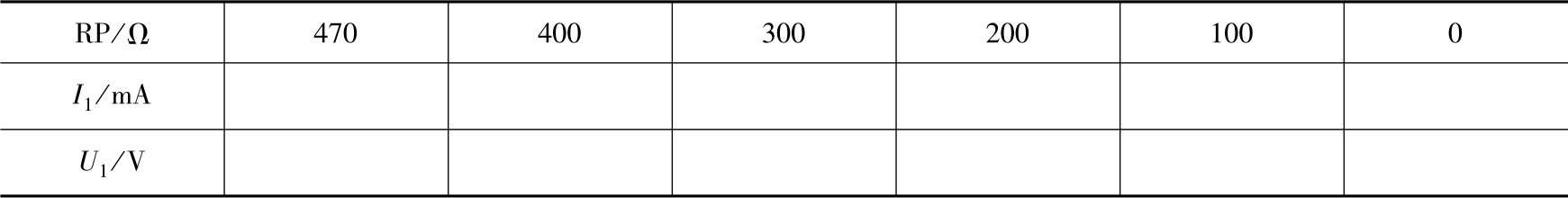 如图1-47所示,电源 U S 用恒压源中的+5V的输出端, R 1 为200Ω的固定电阻,调节电位器RP(470Ω),令其阻值由大到小变化,分别将电流表、电压表的读数 I 1 、 U 1 记录至表1-17中。
