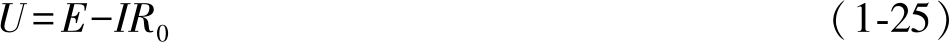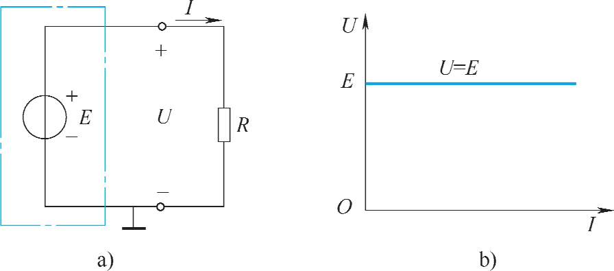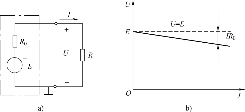 伏安特性曲线表示在图1-51b中。端电压 U 随着电流 I 增加而下降,内阻 R 0 越小,特性曲线就越靠近图中的虚线,就越接近理想情况。