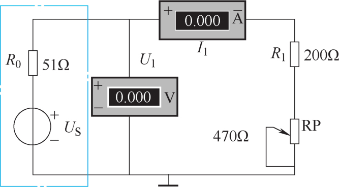 如图1-48所示,将恒压源改成实际电压源, R 0 为51Ω的固定电阻,调节电位器RP,令其阻值由大到小变化,分别将电流表、电压表的读数记录至表1-18中。