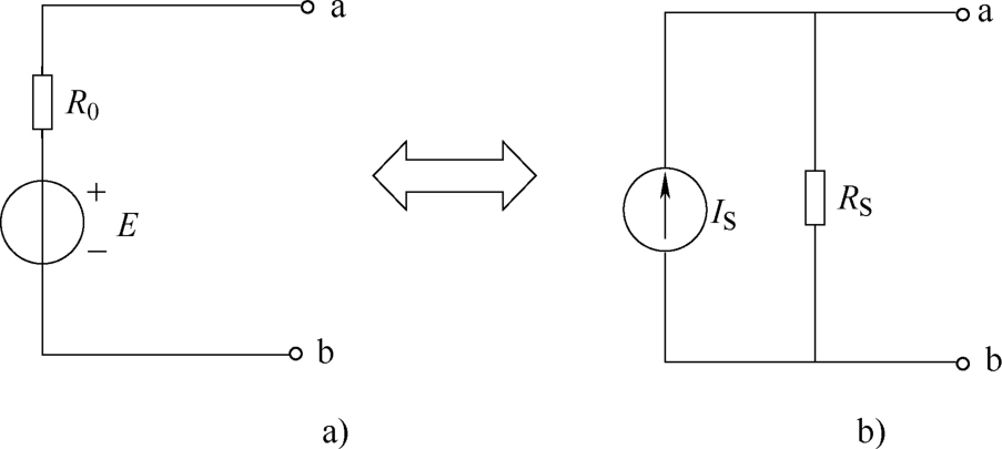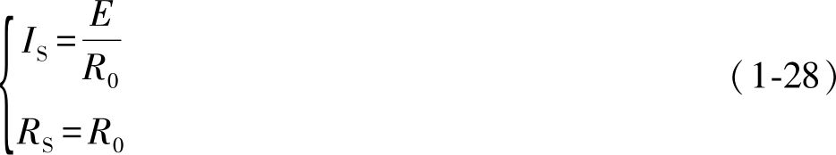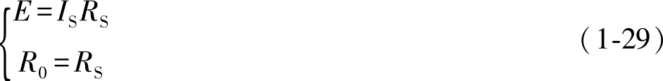 图1-55a所示是一个电压源 E 与电阻 R 0 并联的模型,根据戴维南定理,得到其等效电路如图1-55b所示。这样就把一个电压源模型用电流源模型来等效变换,等效变换的条件是