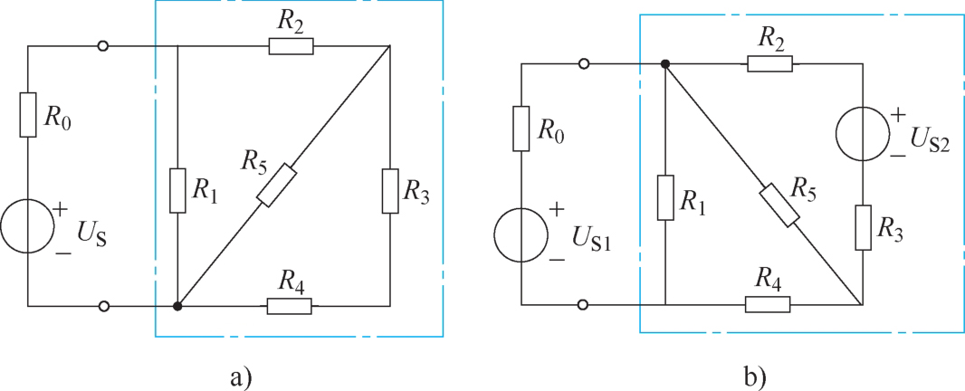 由若干元件组成的部分电路,不论其内部如何复杂,但最终只有两个端口与电路的其他部分相连。在电路分析中就可以把这部分电路看作一个整体,称为 单口网络或二端网络 ,例如,图1-54中点划线所框部分即为单口网络。单口网络分为两类,图1-54a中不包含电源,称为 不含源单口网络 ;图1-54b中包含电源,称为 含源单口网络 。