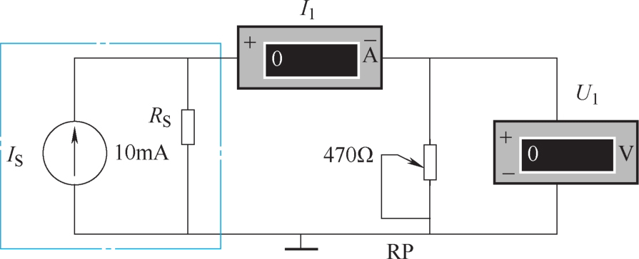 如图1-49所示, I S 为恒流源,调节其输出为10mA(用毫安表测量),在 R S 分别为1kΩ(接入)和∞(断开)两种情况下,调节电位器RP,令其阻值由大至小变化,将电流表、电压表的读数计入表1-19和表1-20中。