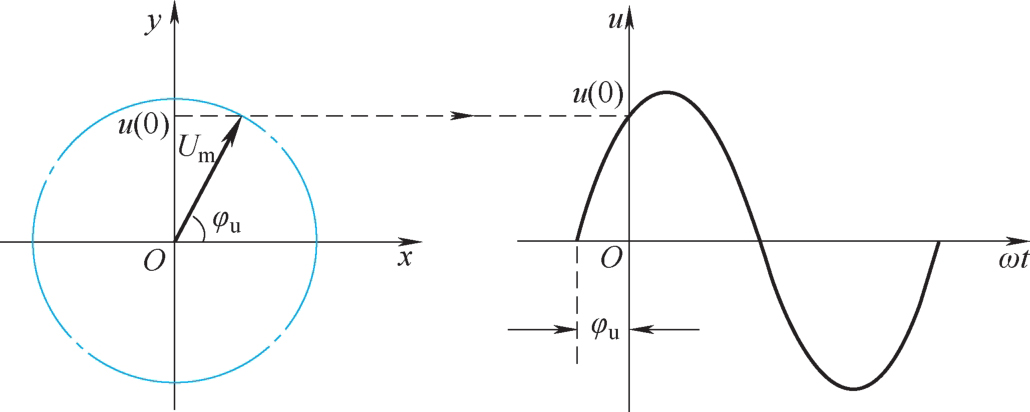 假设有一正弦电压 u = U m sin( ωt + φ u ),在 t =0时, u (0)= U m sin φ u 。如图2-14所示,在直角坐标平面上画一个矢量,它的模等于正弦电压的最大值 U m ,矢量与横轴的夹角等于正弦电压的初相角 φ u ,则该矢量在纵轴上的投影就等于此时正弦电压的数值 u (0)= U m sin φ u 。