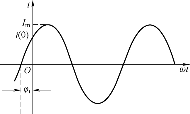 初相角 φ i 与计时起点( t =0)有关,而计时起点是人为选取的。图2-9所示的情况是 φ i >0,为正值, i (0)>0。