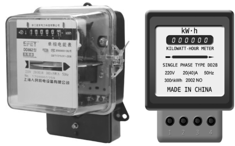 图2-16 单相机械式电能表实物图、仿真软件中单相机械式电能表示意图