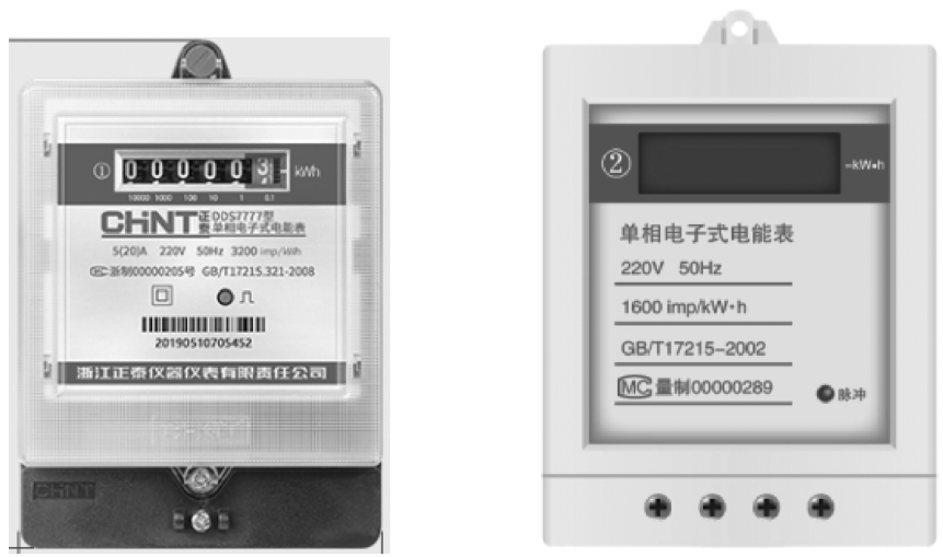 图2-17 单相电子式电能表实物图、仿真软件中单相电子式电能表示意图