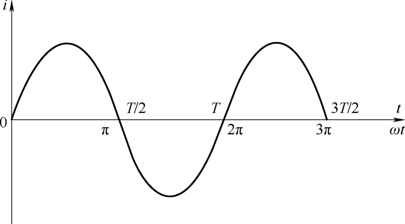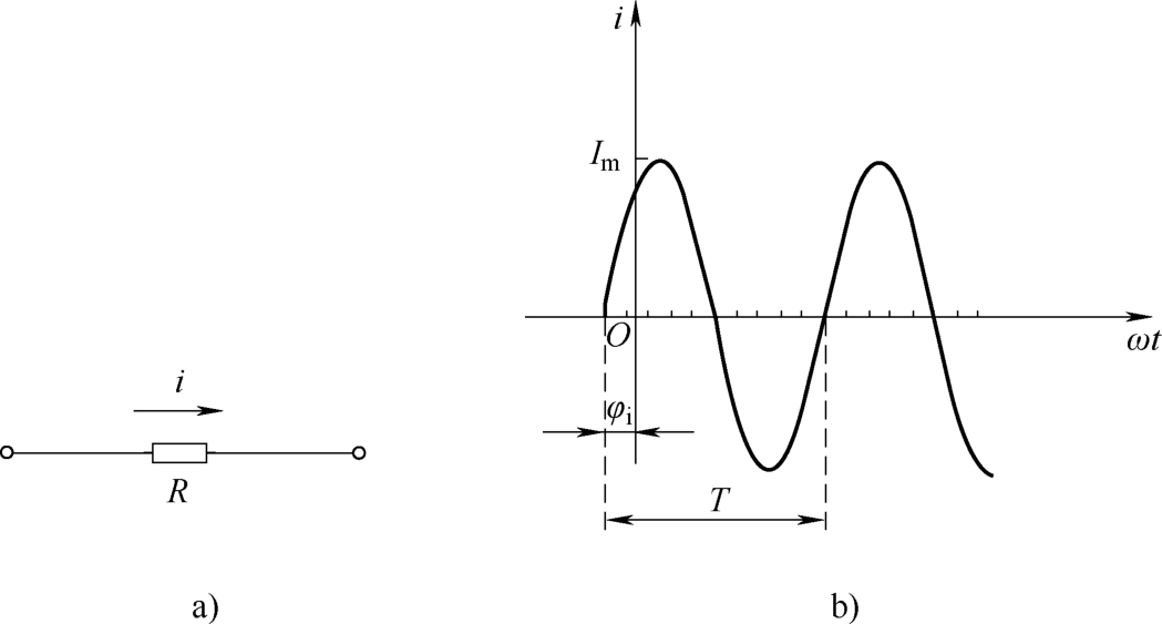在分析计算正弦交流电路时,首先要假定正弦交流电的参考方向。在图2-6a所示的电路中,正弦电流 i 的参考方向用箭头标示。相应的电流波形如图2-6b所示,在波形的 正半周, i 是正值,表明这时电流的实际方向与图示参考方向一致; 反之,在波形的 负半周, i 是负值,表明这时电流的实际方向与图示参考方向相反。 与波形图相对应,该正弦电流的数学表达式为