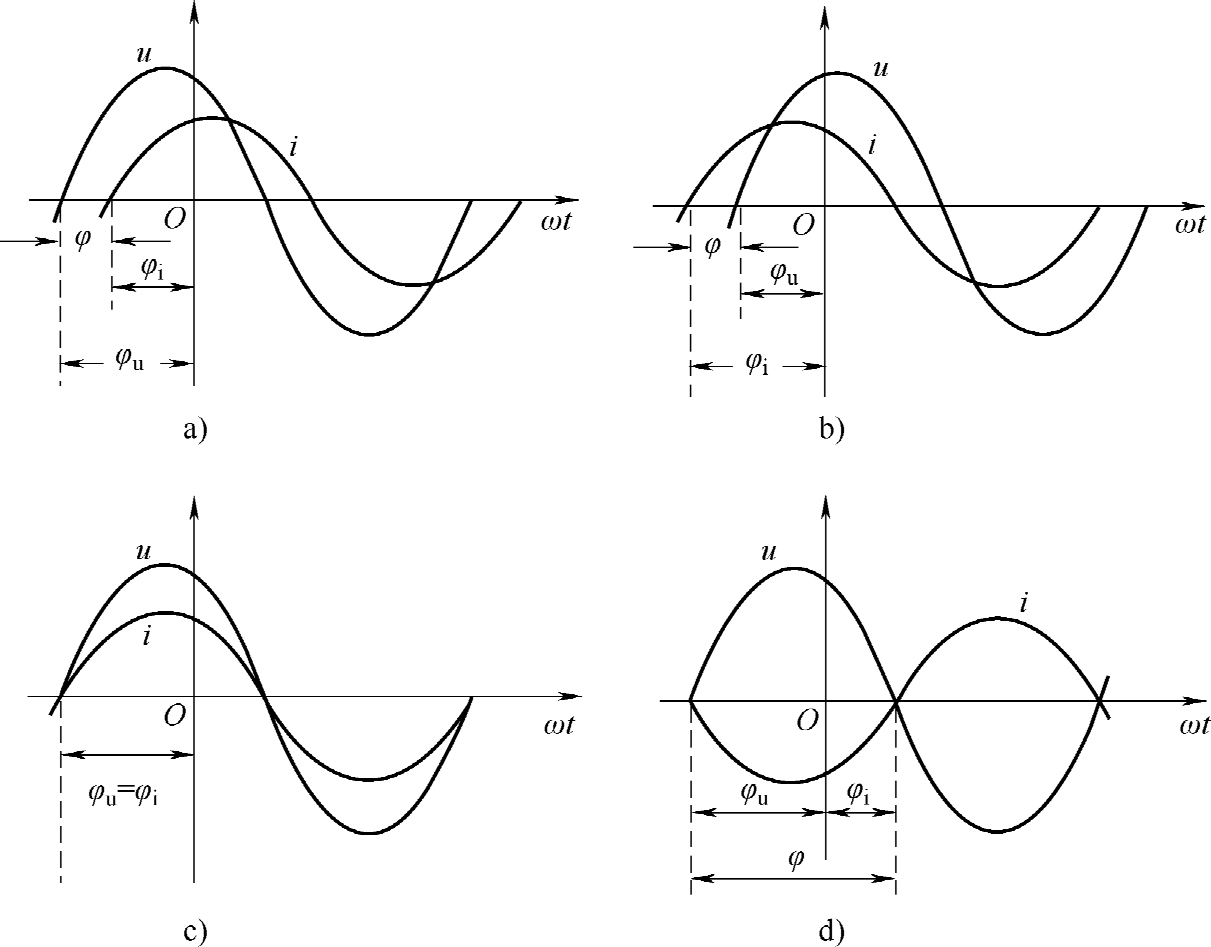 2)当 φ u < φ i 时,相位差 φ = φ u -φ i <0,此时 u 的变化进程滞后于 i 一个 φ 角,或 i 超前于 u 一个 φ 角。波形如图2-11b所示。