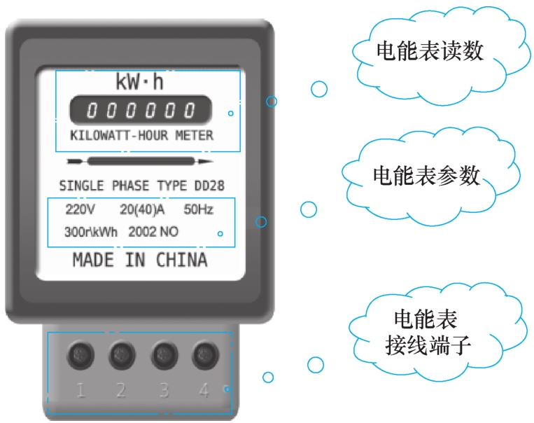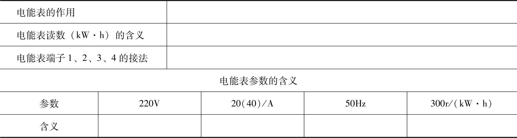 5)图2-4为单相电能表示意图,电能表的作用是什么?在线路中四个端子如何接线?电能表的参数有哪些?各参数的含义是什么?完成表2-4。
