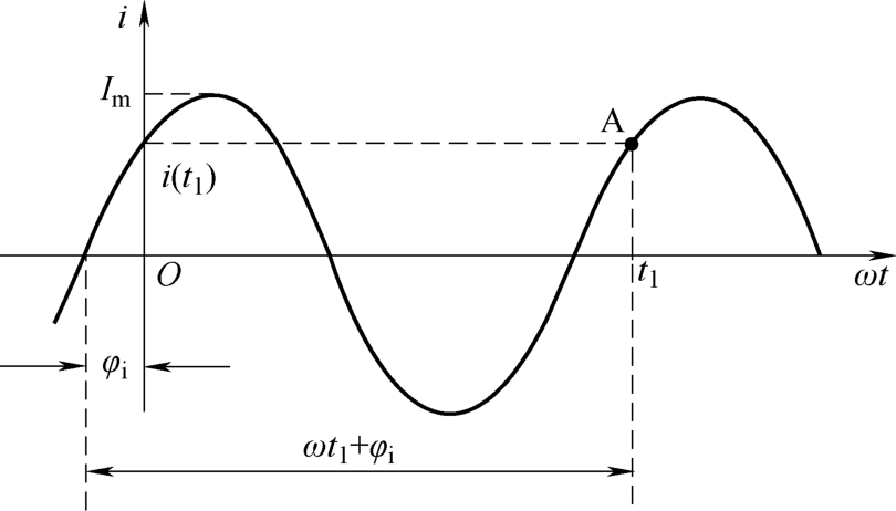 以正弦电流为例,其最大值 I m 和角频率 ω 确定之后,正弦电量随时间变化的进程就由它的电角度( ωt + φ i )确定。所谓随时间变化的进程就是正弦电量随时间变化到任一时刻 t 1 ,在时间轴上为一确定点,并决定了该时刻正弦量的 状态: 正、负值,数值大小和变化趋势 。如图2-8所示, t = t 1 时,对应波形的A点,该点瞬时值 i ( t 1 )>0,为正;数值大小由其在纵轴上的截距决定,数值变化趋势是数值增加。正是电角度( ωt + φ )确定了正弦电量随时间变化的进程,决定了正弦电量的状态,因此称 ωt + φ 为相位角,简称相位。